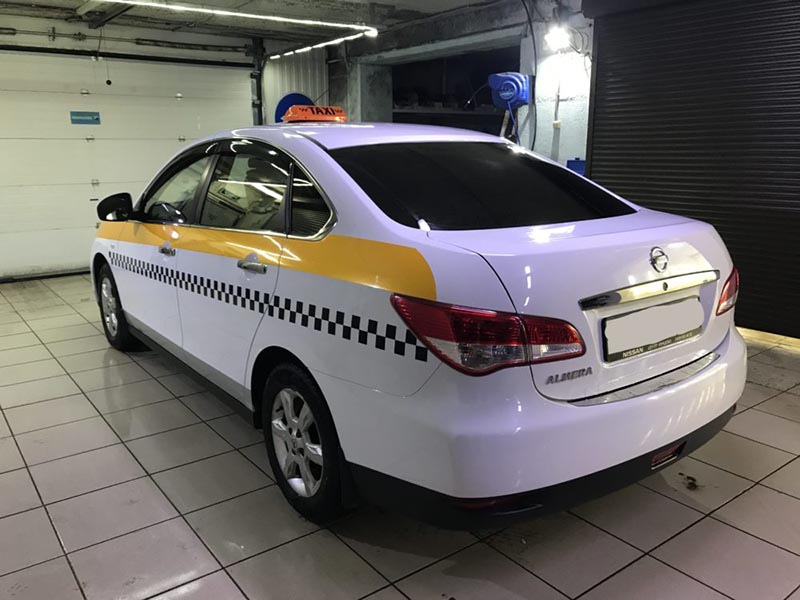 После оклеивания такси, автомобиль остаётся в тёплом помещении для улучшения адгезии материалов. А спустя некоторое время снятые детали возвращаются на место.
